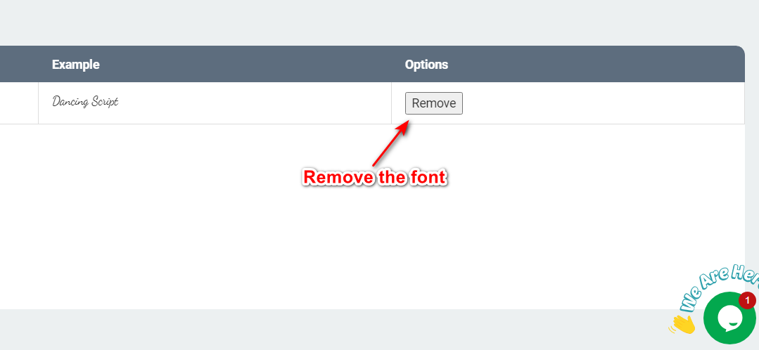 If you need to remove or make adjustments to a font, locate it in the fonts list. Next to each font, you'll find options to either edit its settings or remove it completely from the library. Removing a font will prevent it from being available to customers.